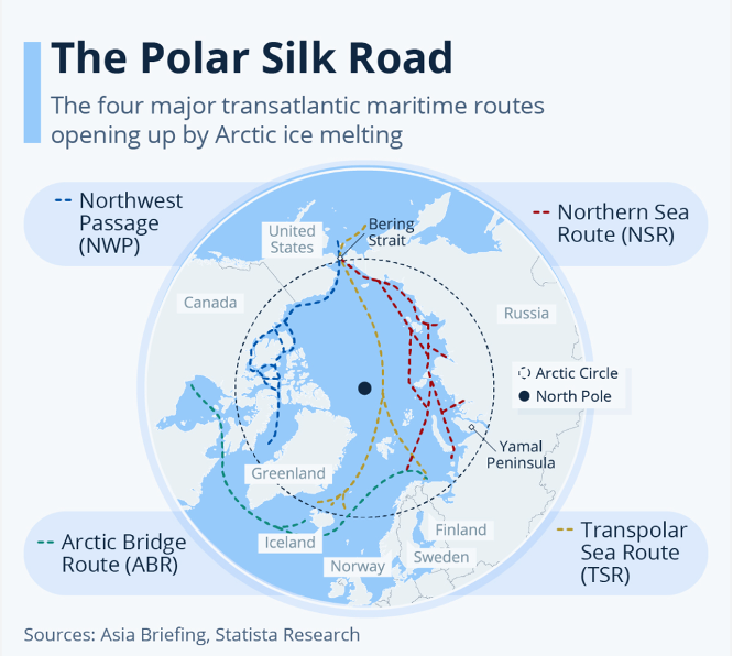O Ártico tem se tornado cada vez mais relevante no cenário internacional devido às suas vastas reservas naturais e às novas rotas comerciais que o derretimento das geleiras possibilita. O acesso facilitado a petróleo, gás natural e minerais coloca a região no centro de uma disputa econômica de grande importância, que envolve diretamente a soberania e o controle desses recursos por parte dos países do entorno, Russia, China e Estados Unidos. A Rota do Mar do Norte, por exemplo, representa uma alternativa logística que encurta significativamente o percurso entre Europa e Ásia, o que atrai o interesse não apenas dos países árticos, mas também de players externos, que veem nessas vias uma chance para ampliar sua influência econômica e também cultural.chinesa.