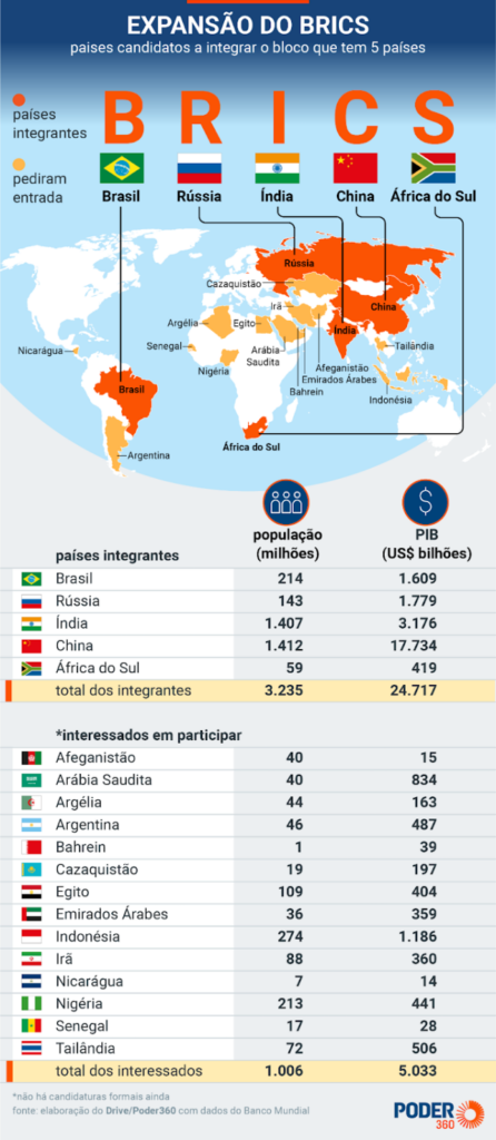 Em 2023, o BRICS anunciou a expansão do grupo, convidando países como Irã, Argentina, Egito, Etiópia, Arábia Saudita e Emirados Árabes Unidos. A medida visa ampliar a influência global do bloco, especialmente no Oriente Médio e na África.