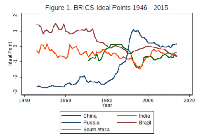 Ao se observar a trajetória histórica das posições políticas adotadas por Brasil, Rússia, Índia, China e África do Sul em votações multilaterais, especialmente na ONU, nota-se que as preferências nacionais apresentaram uma relativa convergência entre o pós-guerra e o fim da Guerra Fria, atingindo seu ponto de maior proximidade no final dos anos 1980.
