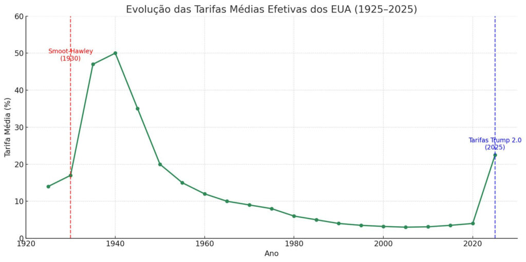 Quase um século depois, em 2025, os Estados Unidos voltam a adotar uma política tarifária agressiva, agora sob o governo de Donald Trump. Embora o contexto seja diferente, os ecos do passado são evidentes. Justificadas como uma forma de “equilibrar o jogo” e aplicar reciprocidade, suas chamadas “tarifas recíprocas” exemplificadas em um quadro com o nome de todos os países para que todos vissem, foram impostas sem distinções — independentemente de os países afetados serem aliados históricos ou rivais estratégicos —, acirrando tensões com a China, tida por Trump como sua principal inimiga.